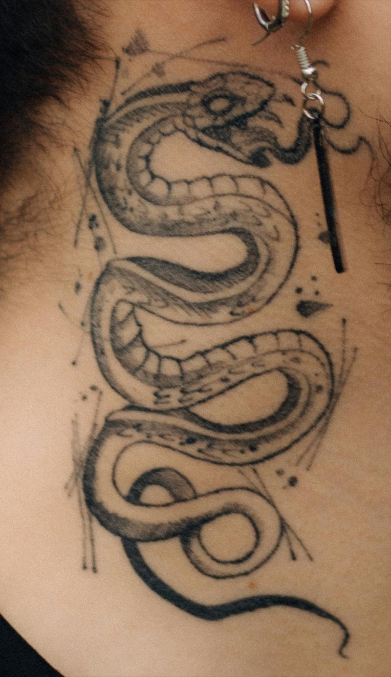 A coiled snake runs the full length of the side neck, the body looping back on itself three times from the head at the top down to the curling tail at the base. The scales are sketched in with light linework and soft black and grey shading rather than solid fills, giving the body dimension without going heavy on ink. Scattered geometric accents sit in the background, small dots and thin lines that frame the snake.