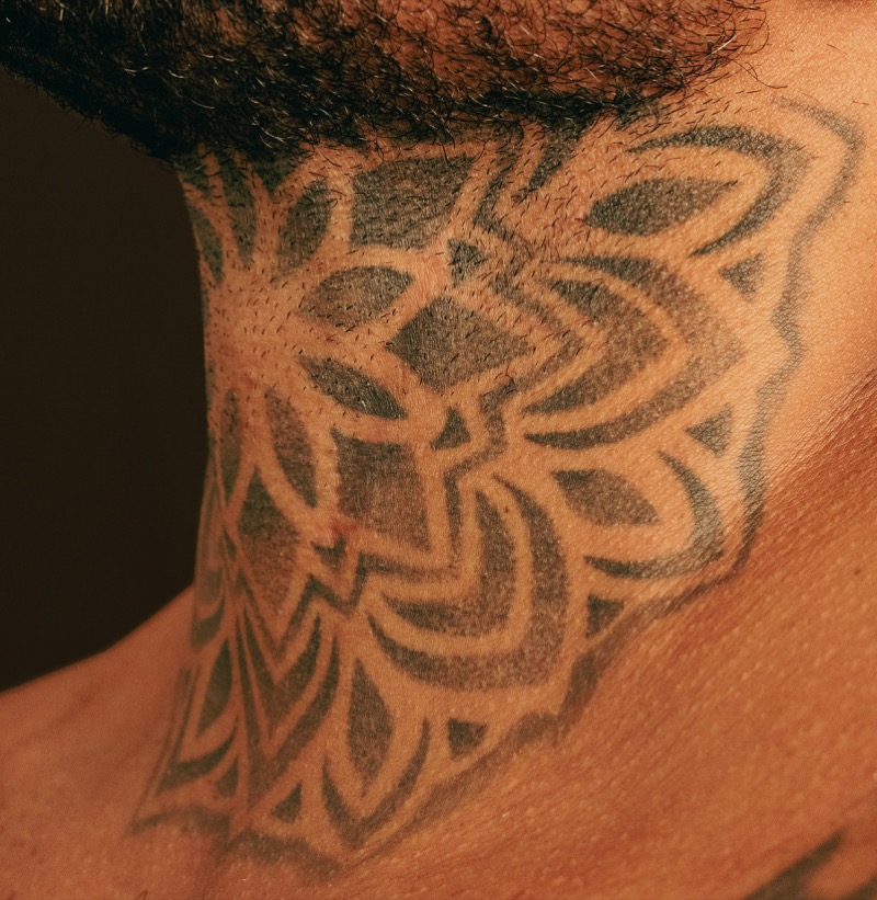 The neck is one of the harder placements to heal well. Skin here is thin, moves constantly, and gets sun exposure even when you think it does not, so the solid black sections can fade and blur faster than the same work on your arm or chest. Budget for at least one touch-up session within the first year, and take sun protection seriously if you want the linework to stay sharp. This is also a placement that stays visible in almost every professional setting, so go in knowing that rather than finding out after.