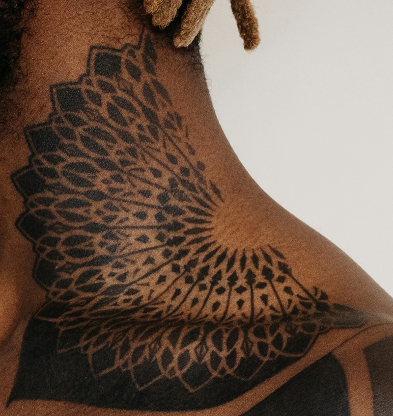 A piece this size covering the full side of the neck and chest is a serious multi-session commitment, and the tight interior pattern work will be the first area to show spreading as the ink ages, particularly in the densest sections at the center. Solid black geometric work holds up well over time on darker skin tones where contrast stays strong, but consistent SPF on the neck will slow the fading considerably. Find an artist with a documented portfolio of large-scale geometric work on darker skin specifically before booking.